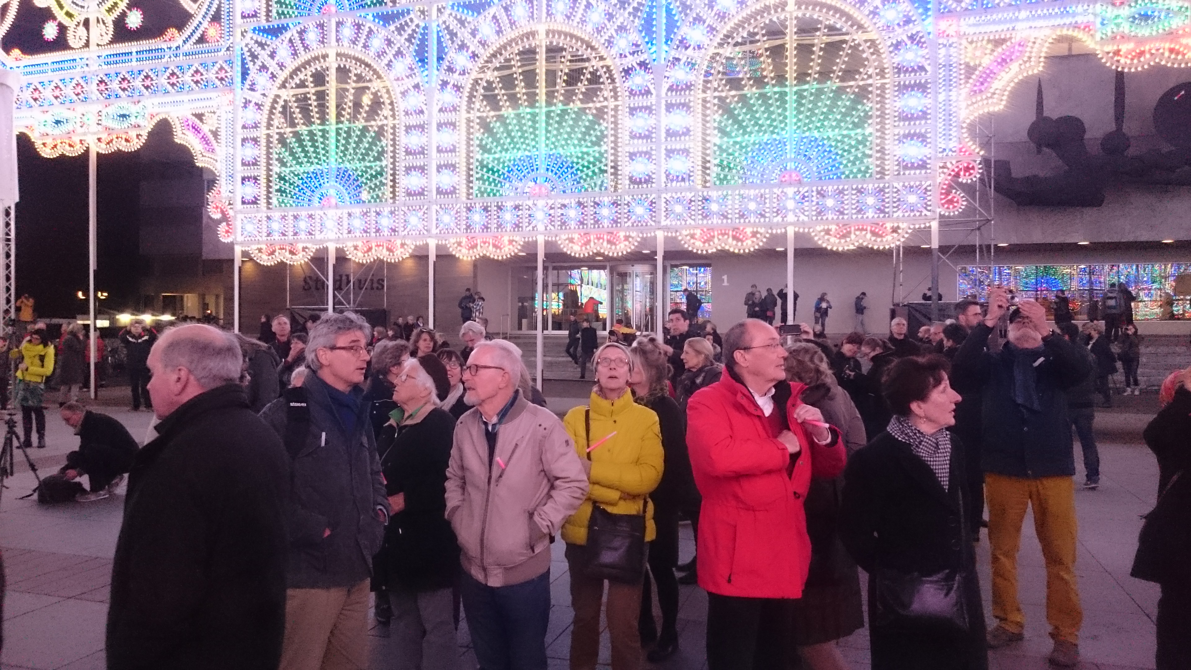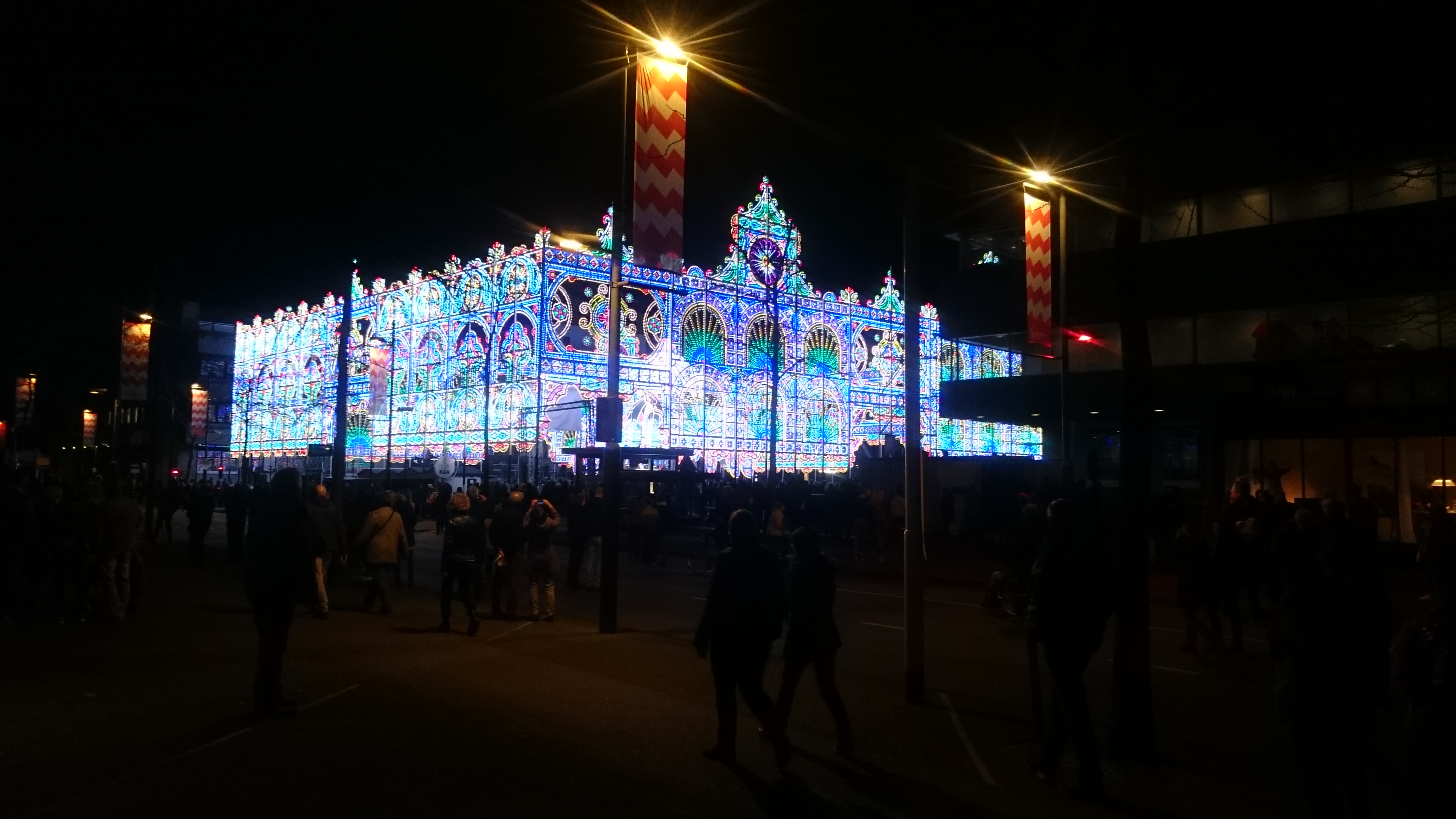 simpel als vernuftig: om elke lamp tientallen opengeknipte petflesjes, die samen een sereen lichtende bol vormden. Zo keerden we langzaam terug naar het centrum, waar ons nog enkele spectaculaire kunstwerken wachtten. We kregen alvast een 3D-brilletje voordat we bij de Catharina-kerk aankwamen. We zochten een strategisch goede plek, en na anderhalve minuut aftellen startte de show tegen de donkergrijze voorzijde van de kerk. In dezelfde grijze kleuren werden andere vormen op de kerk geprojecteerd: we zagen de muren vervormen, het leek alsof een aardbeving de muren deed schudden en krommen. Delen van de voorzijde leken af te scheuren en naar beneden te komen en onder onheilspellend lawaai keek je plotseling in het interieur van de kerk…. Na nog enkele spectaculaire minuten, herkreeg de kerk tenslotte weer haar statige onwankelbare vorm.