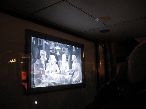 Als eerste zou er in een aantal etalages hetzelfde kunstwerk getoond worden: De aardappeleters van van Gogh. Het bekende schilderij werd eerst getoond als lichtende reproductie. Langzaam begonnen de kleuren flets te w orden en tenslotte zelfs grijs. Plotseling werd één van de “eters” uitgelicht uit de achtergrond en werd de grijze figuur langzamerhand in een plastische vorm van ogenschijnlijk heel fijn wit gaas veranderd, waarna de vervorming steeds verder ging om, uiteindelijk terug te keren tot het oorspronkelijke schilderij.