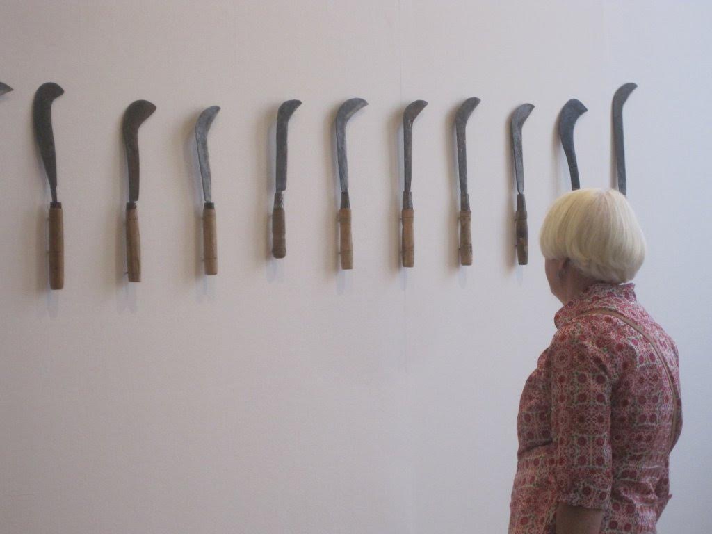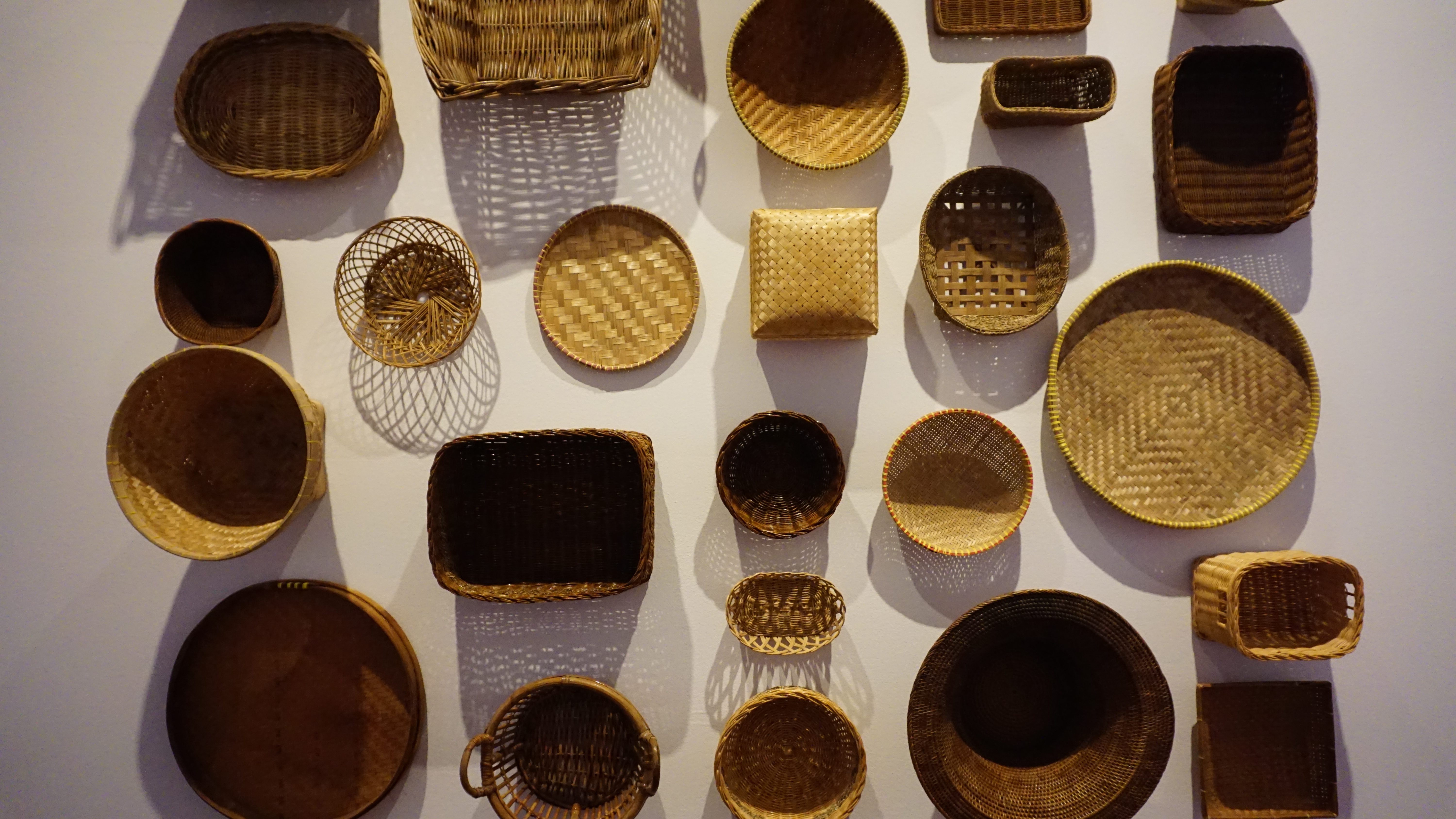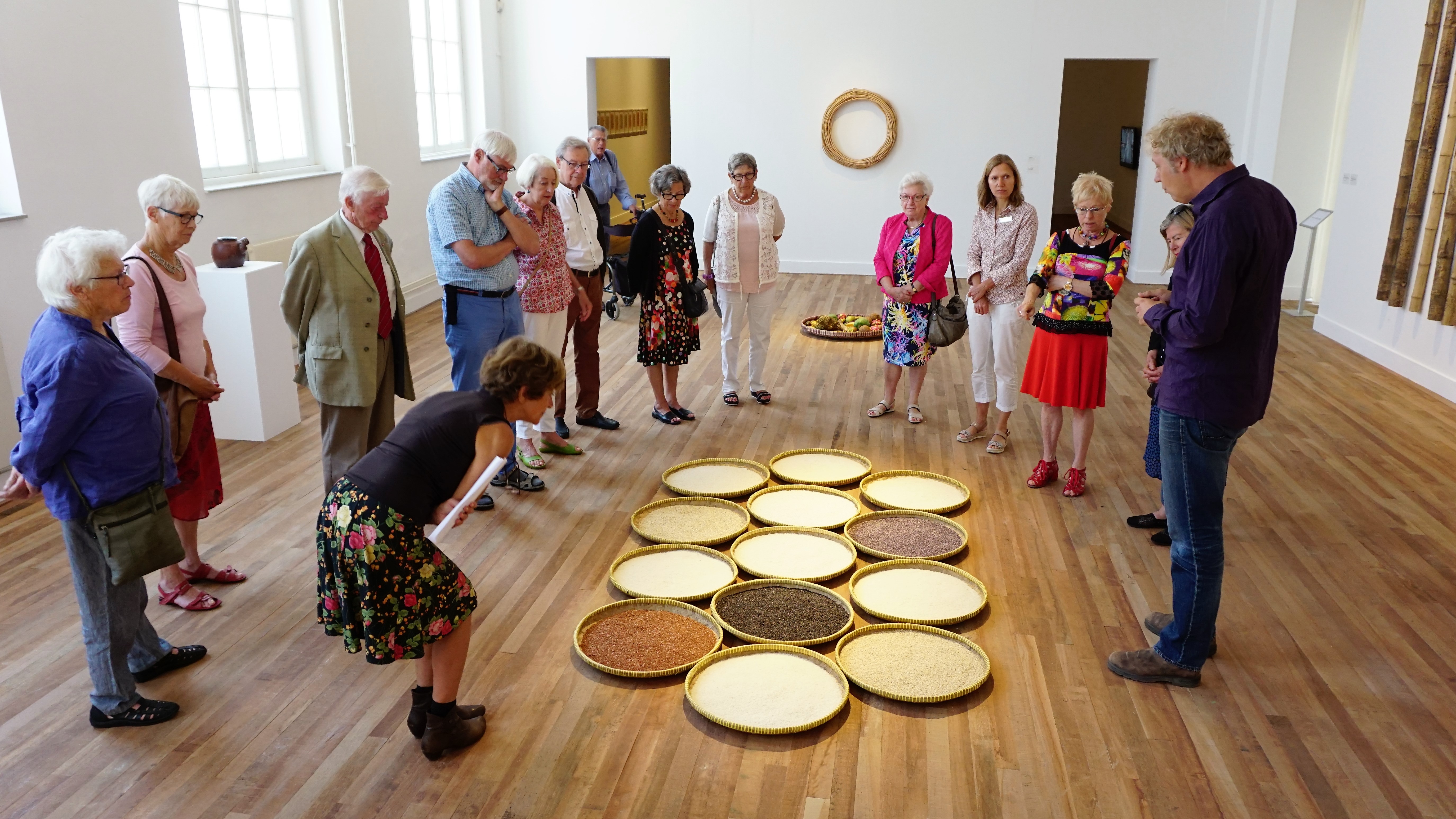 Overigens schrijft herman zelf zijn naam met kleine letter. Hij komt uit de nulbeweging en dat is ook letterlijk te zien in bamboe die tot een nul gebogen is. Bamboe wordt in de derde wereld overal voor gebruikt, het is een sterk materiaal met veel mogelijkheden. De tentoonstelling laat ons kijken naar vorm, kleur, afmeting, dingen die voorbij zijn gegaan, zoals de diverse soorten rijst, die nog door kleine boeren worden geteeld, maar niet meer door de grote bedrijven. Mooi is ook het bord van overvloed en een politiek statement maakt hij door een bord met kruidnagels en nootmuskaat te tonen, wat door ons uit Nederlands-Indië werd gehaald. Het bamboe komt uit de botanische tuin en laat zien hoeveel variatie in een soort is en hoeveel andere soorten er ook zijn! Al met al was dit een boeiende rondleiding en kregen we ook nog de groeten van Roel.