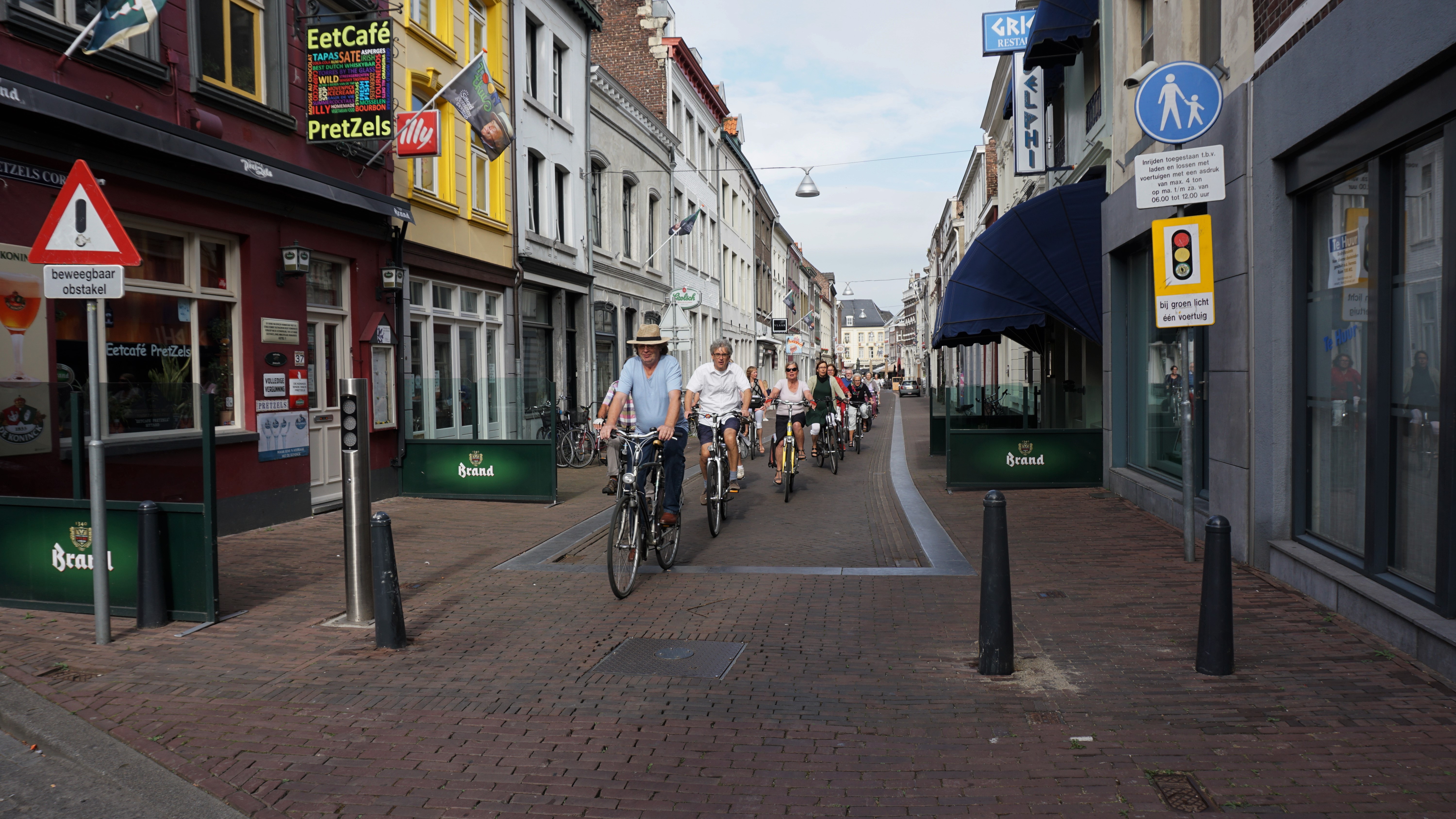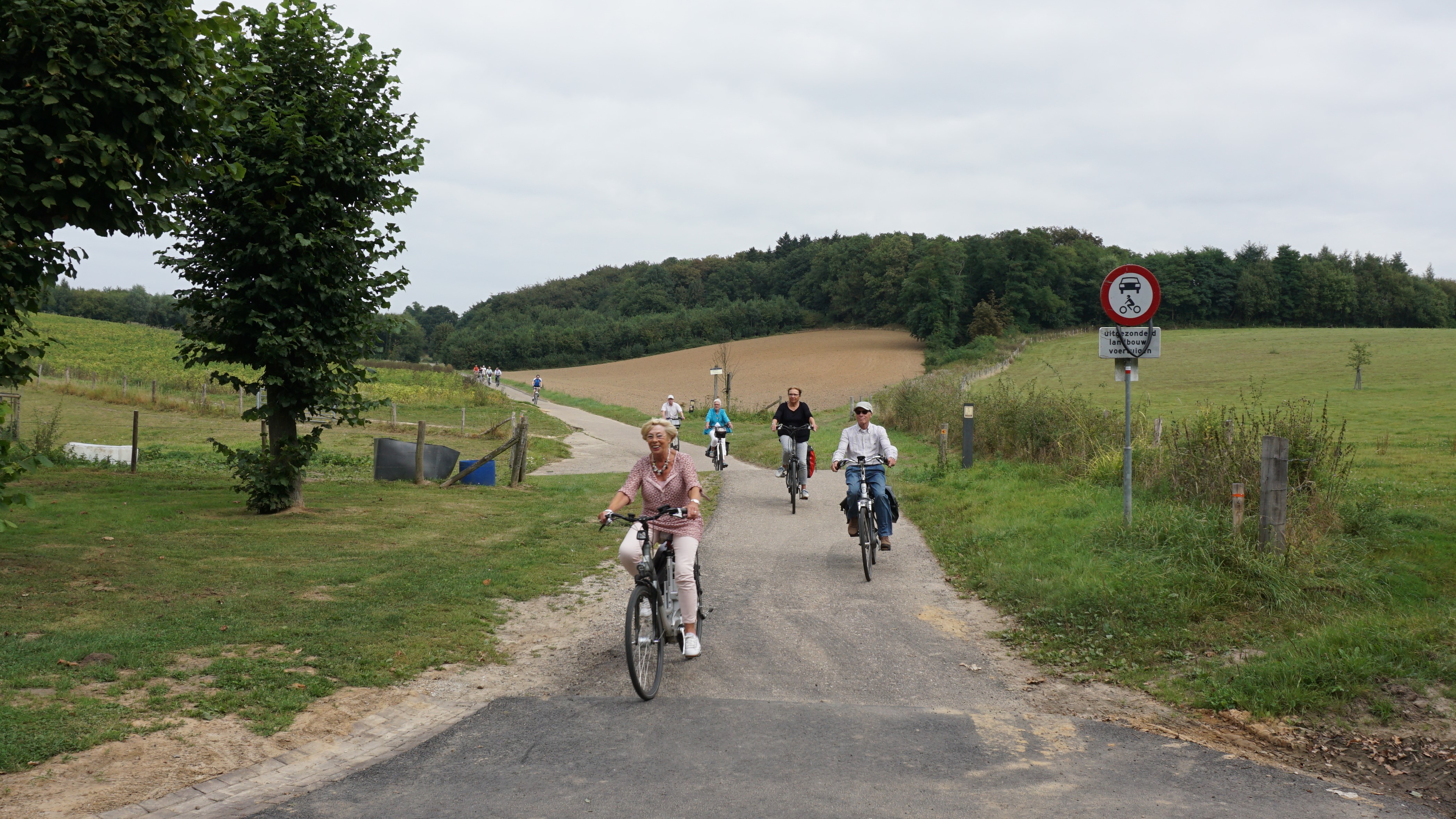 Theo deelde de route uit en reed voorop de stad uit en de Kollenberg op. De ‘Duustergats’ is voor non-e-bikers lastig dus dat werd afstappen en boven, zoals afgesproken, wachten en verzamelen. Hetzelfde tafereel herhaalde zich op de Windraak. Dat heb je nu eenmaal in het Limburgse heuvelland. Eenmaal boven is er altijd de beloning van een mooi uitzicht. Voor schoonheid hoef je niet ver van huis te gaan.