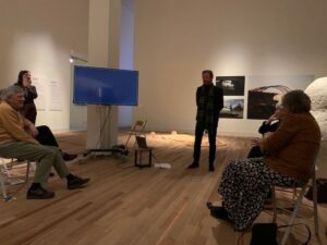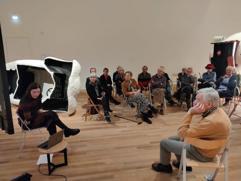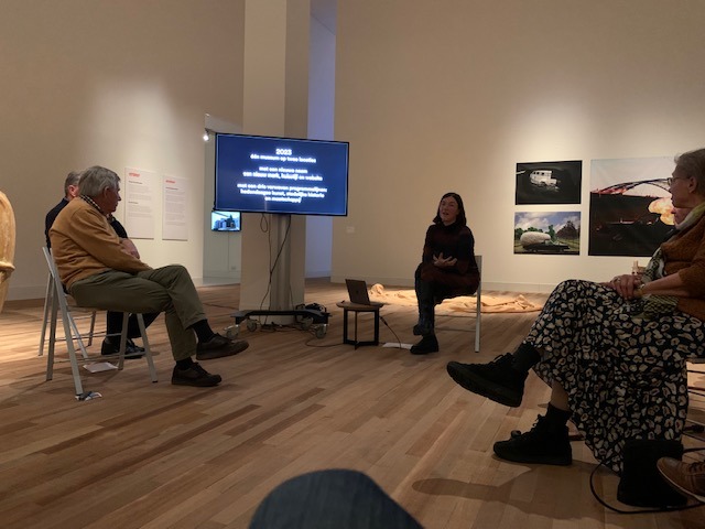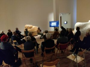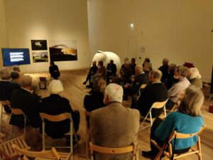 Ongeveer 30 Vrienden trotseerden het koude weer, de gladde wegen, ook al hoefden sommigen slechts één trap af te dalen, of alleen de schootsvelden te passeren. In een uitstekende samenwerking met de staf van de musea was een interessant programma opgesteld. We konden in het museum zitten, midden in Autopia! Na een kort jaaroverzicht door Robert van Lanschot, en een kennismakingsrondje gaf Kris Vleugels een inleiding rond de drie kernwaarden: het Collectief geheugen; gedurfde keuzes; een nieuwe betekenis aan het verleden. Er wordt hard gewerkt aan een nieuwe naam en opzet van de musea -het bestuur van de Vrienden heeft recent aan een klankbordsessie hierover deelgenomen- en een nieuwe introductie. Vermeldenswaardig is ook dat er een prima nieuwe locatie voor het depot is gevonden, al deels ingericht. Guus van Engelshoven gaf een vooruitblik op de exposities voor 2023. “A field guide getting lost / een gids verdwaald” op basis van de collectie; De Salon; Jozef Seymach voor een tweede maal. Tenslotte een vraag- en antwoord sessie, tweerichtingsverkeer. Geschuifel met stoelen en gekuch was de subtiele hint om over te gaan tot de borrel in het café van het Filmhuis, waar het tot sluitingstijd (23:00 uur) gezellig was!