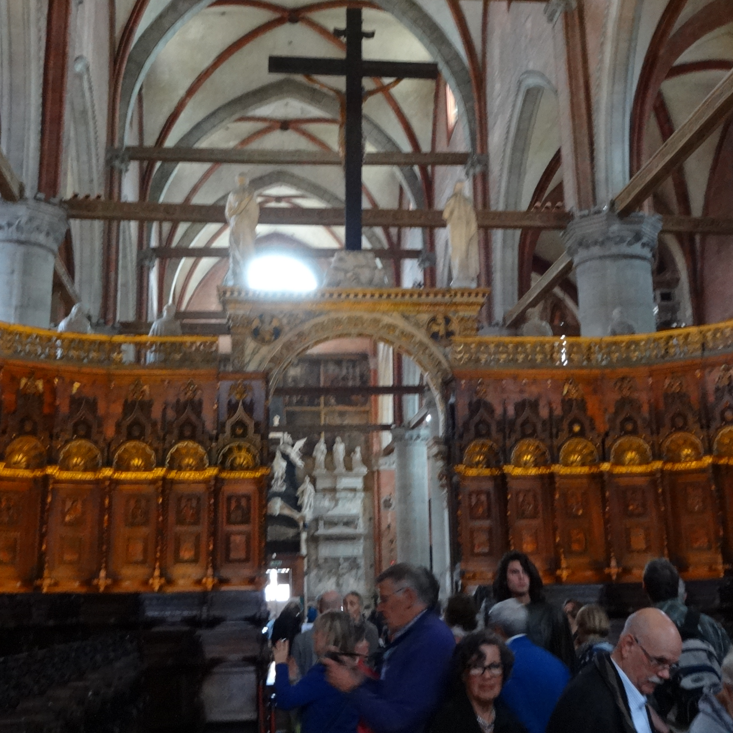 Voor ons, groep Düsseldorf, na een zondagnamiddag en -avond in Mestre, het eerste bezoek aan de Dogenstad. Vanaf de eindhalte van de bus te voet over bruggetjes, door steegjes, langs water, achter de voor”hoed”e aan. Wennen aan gezichten, namen, groep en de omgeving. Dankzij de pest overal hermetisch afgesloten waterputten, maar gelukkig ook terrasjes waar je zonder ziek te worden een wijntje en watertje kon drinken. Volgens onze gids Norbert was San Rocco de moeite waard en na kort overleg gingen we met korting naar binnen. De begane grond was de moeite waard maar op de eerste verdieping: verbazing! Ik heb al veel oude kunst gezien en denk er soms op uitgekeken te zijn, moderne kunst raakt mij meer, maar dit was indrukwekkend. En handige spiegels om naar het plafond te kijken: heeft Leonardo dat uitgevonden? Grandioos, nooit eerder gezien. Ik dacht even dat iedereen met een tablet rondliep. Ook een cache “gescoord”. Op de verdere wandeling ook de gesloten tentoonstellingen niet kunnen zien, tsja, wereldwijd maandag. Mijn herinneringen zijn als de steegjes van Venetië: onontwarbaar, boeiend, mooi. De eerste groepsreis voor mij, conclusie: Ik geef me alvast op voor over twee jaar.