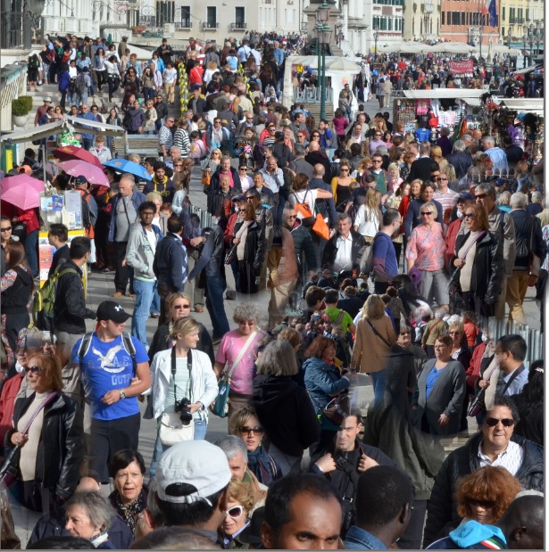 De bushalte in Mestre is op de Corso del Popolo. De volgeladen harmonicabus wordt nu in zijn geheel gevuld. Hangringen en stangen houden ons in evenwicht. Soms kiept er iemand om in een bocht of bij het sterke remmen. Andere passagiers deinen mee en houden de anderen overeind. De grote dam door de lagune geeft blikruimte op het water, de bevoorradingsboten in de vaargeul en de eilanden. Na 30 minuten is de Piazale Roma het eindpunt. De kanalenstructuur van de stad wordt zichtbaar. Boogbruggen overspannen het water, vaporetto’s, grote en kleine vrachtboten brengen leven in het water. Honderden bezoekers lopen over de Calatravabrug de stad in, langs het eindstation Santa Lucia naar de opstapplaats van vaporetto lijn 1 naar het San Marco plein. De groep activeert nog wat onwennig de kaart voor het openbaar vervoer en perst zich in en op het busbootje in het Canal Grande. Je kunt voorop staan of zitten, als er al plaats is, of benedendeks waar je kunt zitten, als er plaats is, of achterop zitten, als er plaats is. Iedereen moet blijven staan. Ook het transferplatform dat in het midden van de boot is om in en uit te stappen, staat helemaal vol. De ijzeren dakbalken kun je gebruiken om je vast te houden, als je lang genoeg bent. Prachtige paleizen en kerken “drijven” voorbij, als je een beetje zicht hebt, terwijl het bootje 16 x aanlegt, passagiers afzet en opneemt en weer met steeds dezelfde routine zijn route vervolgd. Andere busboten moeten vaak wachten, luxe, glanzend gelakte watertaxi’s kruisen ons waterpad in het steeds maar bewegende water. Met wat wiebelige benen staat de groep bij San Zaccaria niet ver van het San Marcoplein op de kade. Een overstelpende massa toeristen en dagjesmensen geven het idee dat er net een popfestival is afgelopen. De groep wordt moeizaam bij elkaar gehouden. Iedereen lijkt op iedereen, iedereen is actief gericht op de mooie gebouwen en iedereen is druk met foto’s maken. Rechts is de Brug der Zuchten waarover de gevangenen na hun veroordeling naar hun cellen werden gebracht. Overal mensen, camera’s, gondels. De groep stroomt mee met de massa en de reisleider zucht alsof hij zelf de brug over moet. Op het San Marco-plein staan onafzienbare rijen voor de Campanille en de kerk. Iedereen wil alles gezien en alles op de foto hebben. De toeristische honger is groot en de groep verdwaalt in de massa. Uitleg gaat verloren, verstaanbaarheid verdwijnt, cultuur en historie maken plaats voor onherkenbaarheid in toeristisch tumult. Ook op de hoogwaterloopplanken is er geen overzicht meer. De groep is verdwenen, opgelost. San Marco heeft het zo gewild.