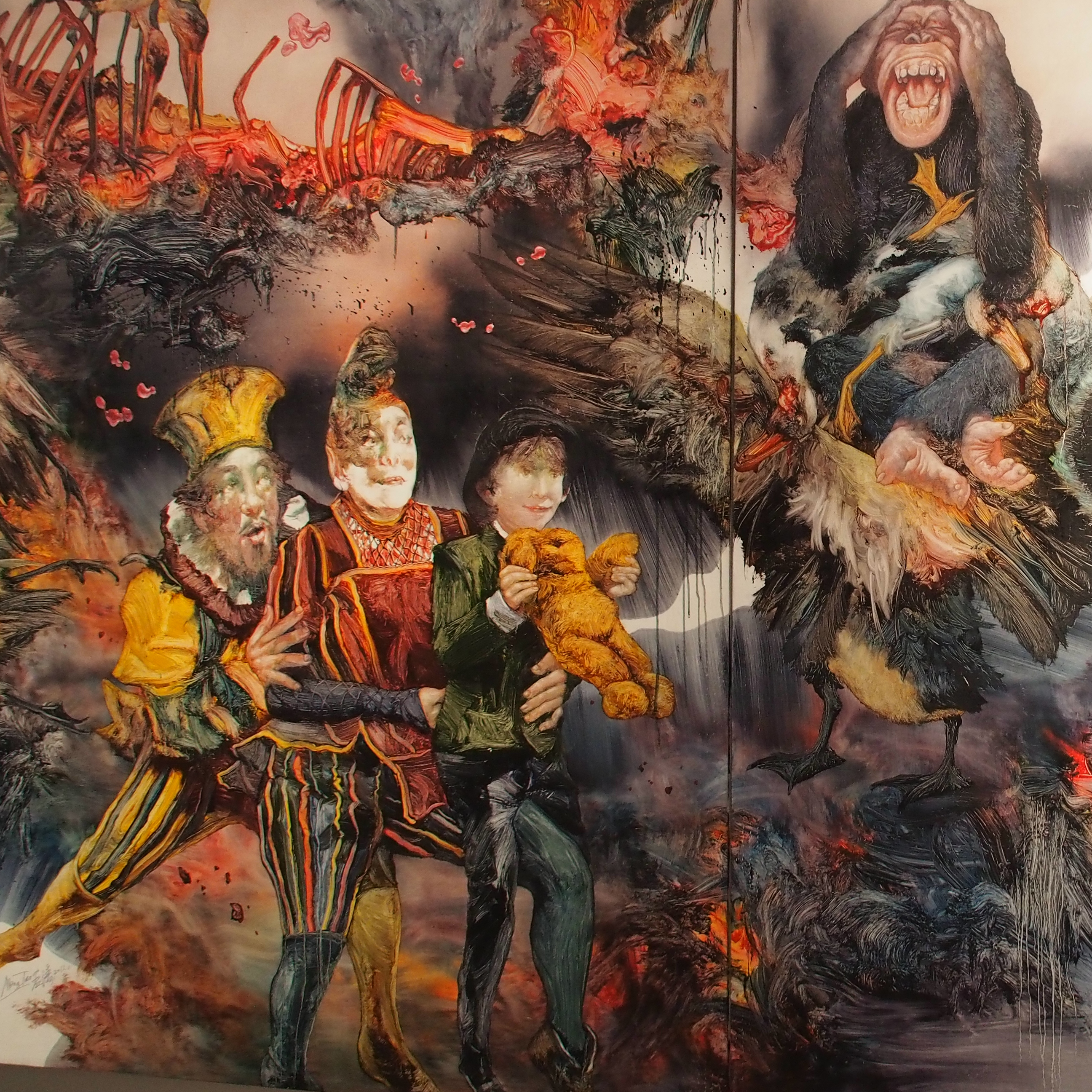 De slotact van de middag was een bezoek aan de inzendingen van de onafhankelijke Chinese kunstenaars. De ruimte – zeer symbolisch gehuisvest aan het moeilijk bereikbare uiteinde van de Arsenale – zinderde van de Chinese dynamiek. Een grote diversiteit aan kunstwerken en kunstvormen explodeert in je gezicht als argeloze bezoeker. Voor mijn verslag heb ik een fragment van het werk van de Chinese kunstenaar Wang gekozen. Twee betrekkelijk jonge mensen lijken te worden weggehouden van het geweld en de waanzin achter hun rug. De wereld achter hun verkeert blijkbaar in een voortdurende barensnood van wreedheid en verderf. Wie nog eens kijkt ziet in het drietal een koningspaar met kind dat zich afwendt van de werkelijkheid en zijn heil ergens anders zoekt. Zo gezien is het werk van Wang een niets verhullende kritiek op het China van vandaag, waarin de machthebbers zich blind lijken te houden voor de corruptie en het politieke geweld in hun samenleving. Wang lijkt te willen zeggen dat die wrede wereld akelig dichtbij komt. Elk moment kan de vloed van geweld het koningspaar overspoelen en hun ondergang inluiden. Een “beter” einde van een bezoek aan de Arsenale is er waarschijnlijk daarom niet.