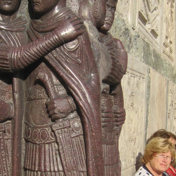 Mijn favoriete dagdeel betreft misschien niet verwacht de Biënnale, maar de donderdagmiddag van de marathon-stadswandeling. Na de lunch onder een van de meest beroemde ruiterstandbeelden ter wereld, de “Colleono” van Verrochio uit 1495 volgt een rondgang door de imposante kerk van Giovanni e Paolo en vervolgens gaat het richting San Marco. En passant de “Maria dei Miracoli” die helemaal bekleed is met schitterende marmeren platen die contra-post geplaatst zijn. De laat-Byzantijnse San Marco “doen ” wij out-side in-side in een half uur. Tijdens de rondgang indrukken opdoen en vooral veel foto’s maken als geheugensteun, realiseerde ik mij dat de moderne kunststroming op-art ( optische kunst ) van de Hongaar Vasarely zijn oorsprong reeds had in de vloerdecoraties van duizend jaar daarvoor. De wereld beroemde mozaïeken, waarin door de bouwgeschiedenis nogal wat tijdsverschillen zichtbaar zijn, stammen rechtstreeks uit het naburige Ravenna. De vier levensgrote paarden zijn kopieën ( Artur Spronken ). De originelen zijn uit de Romeinse Keizertijd en staan in het museum. De foto, een hoekfragment in hoog reliëf bij het noordelijk portaal, toont een viertal krijgers en is zeer waarschijnlijk afkomstig van een burcht die afgebroken is om plaats te maken voor de S. Marco, Byzantijns rond 750 n-Chr. Ondanks het keiharde materiaal, graniet of dioriet, zeer gedetailleerd versierd en de figuren hebben duidelijk een nog Romeinse outfit. Het gebaar dat een van hen maakt kan verschillend worden geïnterpreteerd. Wij zaten op deze ontmoetingsplek bij te komen van de overweldigende indrukken van het Dogenpaleis en in de korte tijd die ons daarvoor gegund werd zijn tientallen foto’s gemaakt van dit reliëf. De vrouw op de foto is mon amour; steeds weer de liaison tussen mij en de hoed van mister ” Kwik-zilver ” als ik weer eens achterop raakte om een foto te maken (615 in totaal ) Norbert en de organisatie: un grand merci!