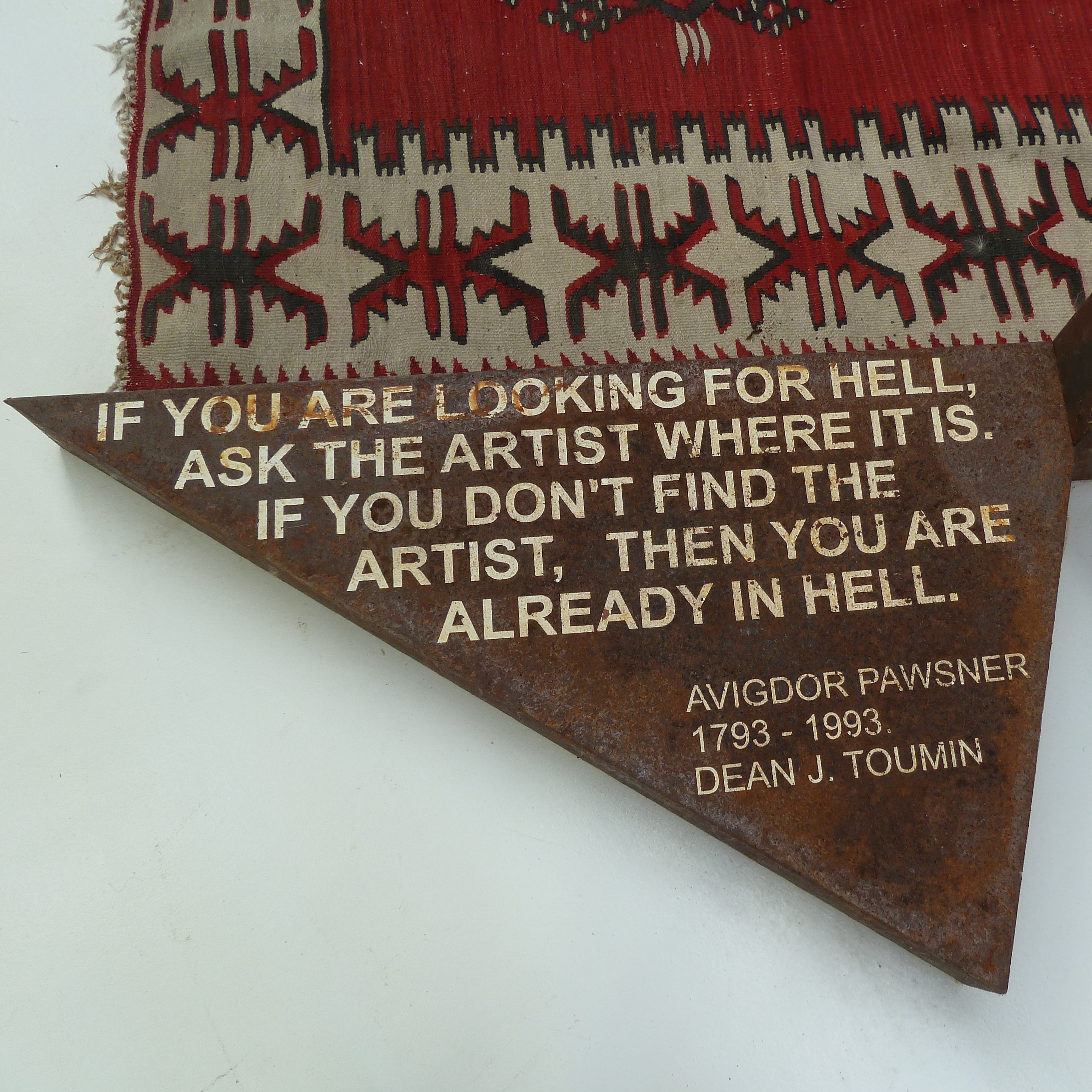 Brussels meets the future: bezoek aan Breath, Mind beating, “Love me, Love me not”:, , Passage to history: “Twenty years of la Biennale di Venezia and Chinese contemporary art”, Andorra, maar vooral “Voice of the unseen Chinese independent art 1979/today”. De groep “Brusselreizigers” zou Arsenale gaan bezoeken: ’s ochtends de hallen aan de zuidzijde, ’s middags de noordzijde. En volgens de groep Düsseldorf zou het kunstaanbod daar niet alleen spectaculair maar ook omvangrijk zijn! Omdat een snelle shuttle alleen op zaterdag en zondag voer, was een lange vaartocht helemaal om Arsenale heen helaas onvermijdelijk! Na een bezichtiging van de helft van een kennelijk voor China bestemd treinstel op ware grootte voor een hogesnelheidslijn (zou Anseldo Breda ook aan China gaan leveren?), een hal met “contemporary art from Azerbaijan and its neighbours” en vooral “Breath” in de Torre di Porta Nuova ( in een rechthoekige behuizing met zwart vilt beklede behuizing, hoor je vanuit vier hoeken het ontroerende gezang van Boeddhistische, Christelijke, Joodse en Islamitische gebeden dat lijkt aan te zwellen en af te vlakken op de ademhaling van de zangers) bekroop ons het gevoel dat er meer moest zijn. En gelukkig na even zoeken bereikten we vijf grote fabriekshallen met daarin veel, overstelpend veel “…. Of the unseen Chinese Independent art…”. variërend van mooie portretten en foto’s tot installaties(deels maatschappijkritische)en Anton Piekachtige taferelen. Eén tekst uit “contemporary art etc.”over de waarde en betekenis van kunst is mij echter het meest bijgebleven (zie afbeelding)